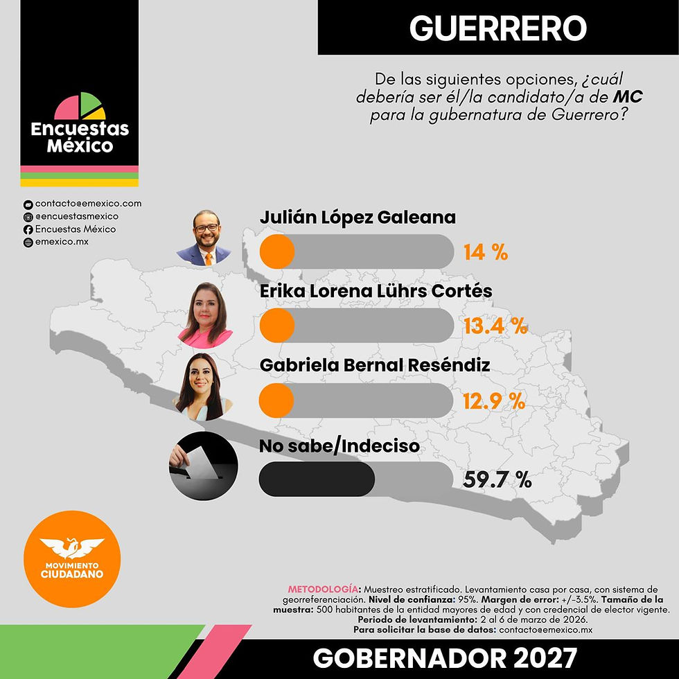 Entre los perfiles evaluados, los diputados locales Julián López Galeana y Erika Cortés registran niveles de apoyo relativamente bajos, con 14% y 13.4%, respectivamente. No obstante, aún hay tiempo para fortalecer su presencia pública y ampliar su base electoral.